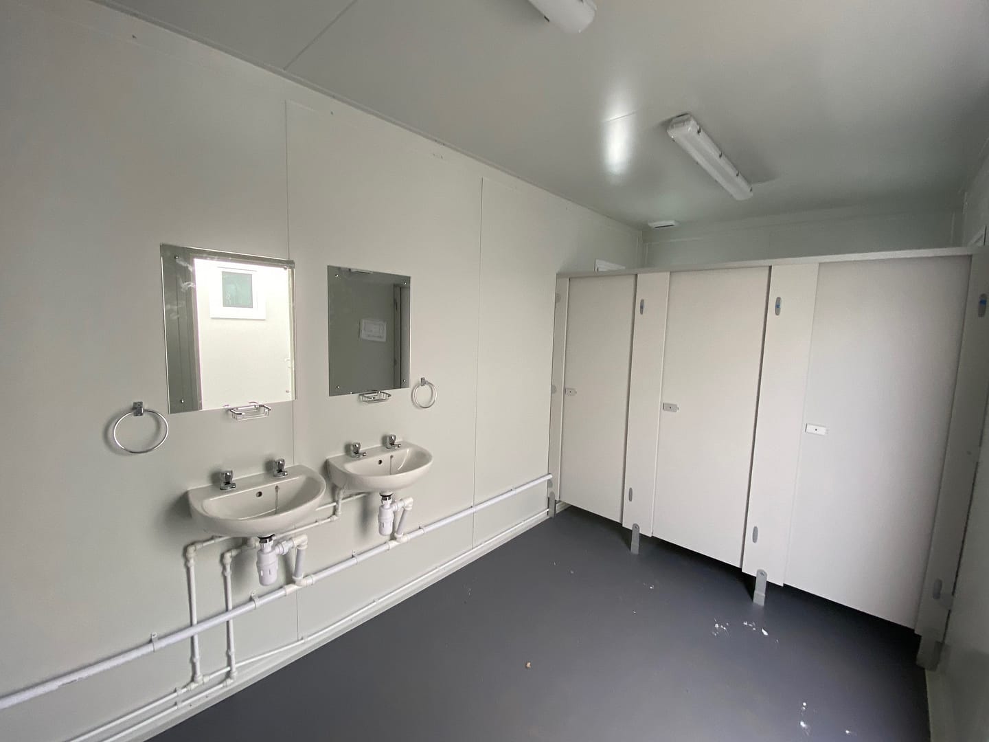 Three cubicles each fitted with mains flushing toilet & toilet roll holder.
